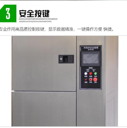 1、三箱設備區分為:高溫區、低溫區、試驗區三部分 ,測試產品置于測試區,沖擊時高溫區或低溫區的溫度沖擊入測試區進行沖擊,測試產品為態式 ;